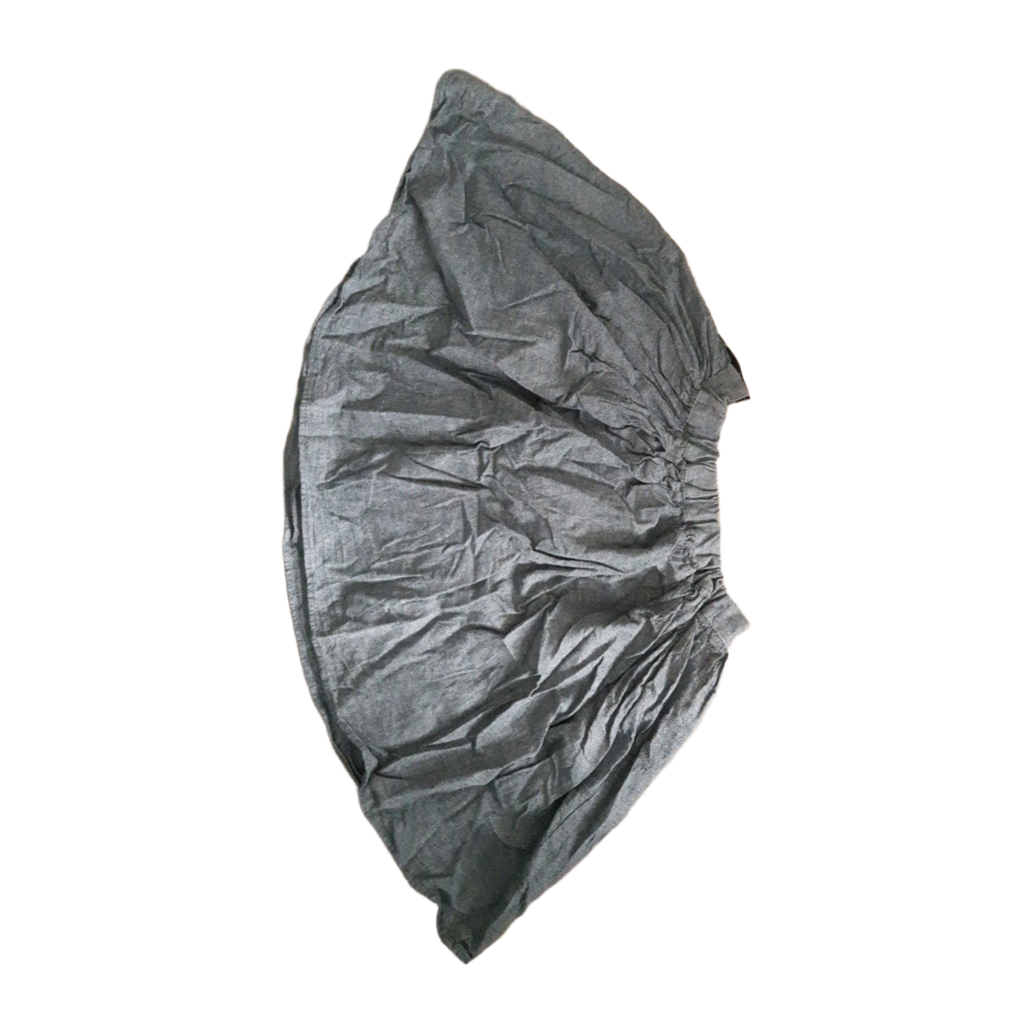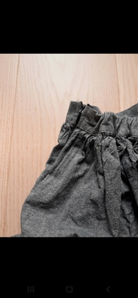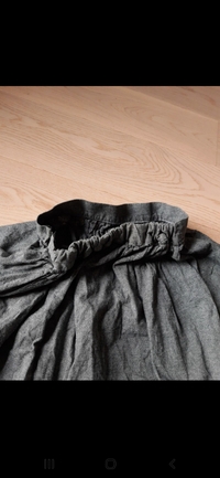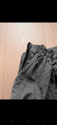 Harmaa hame. Vyötärön puolen yläosa rypytykset ja kuminauhaa, jotka antavat joustovaraa. Hameen reunassa vetoketju. Sopii s-kokoiselle/pienelle m-kokoiselle.