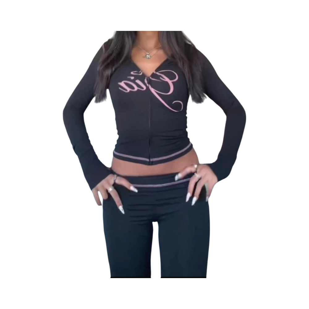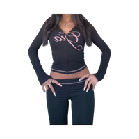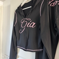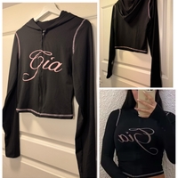 Lyhyt musta vetoketjuhuppari pinkillä tekstillä.