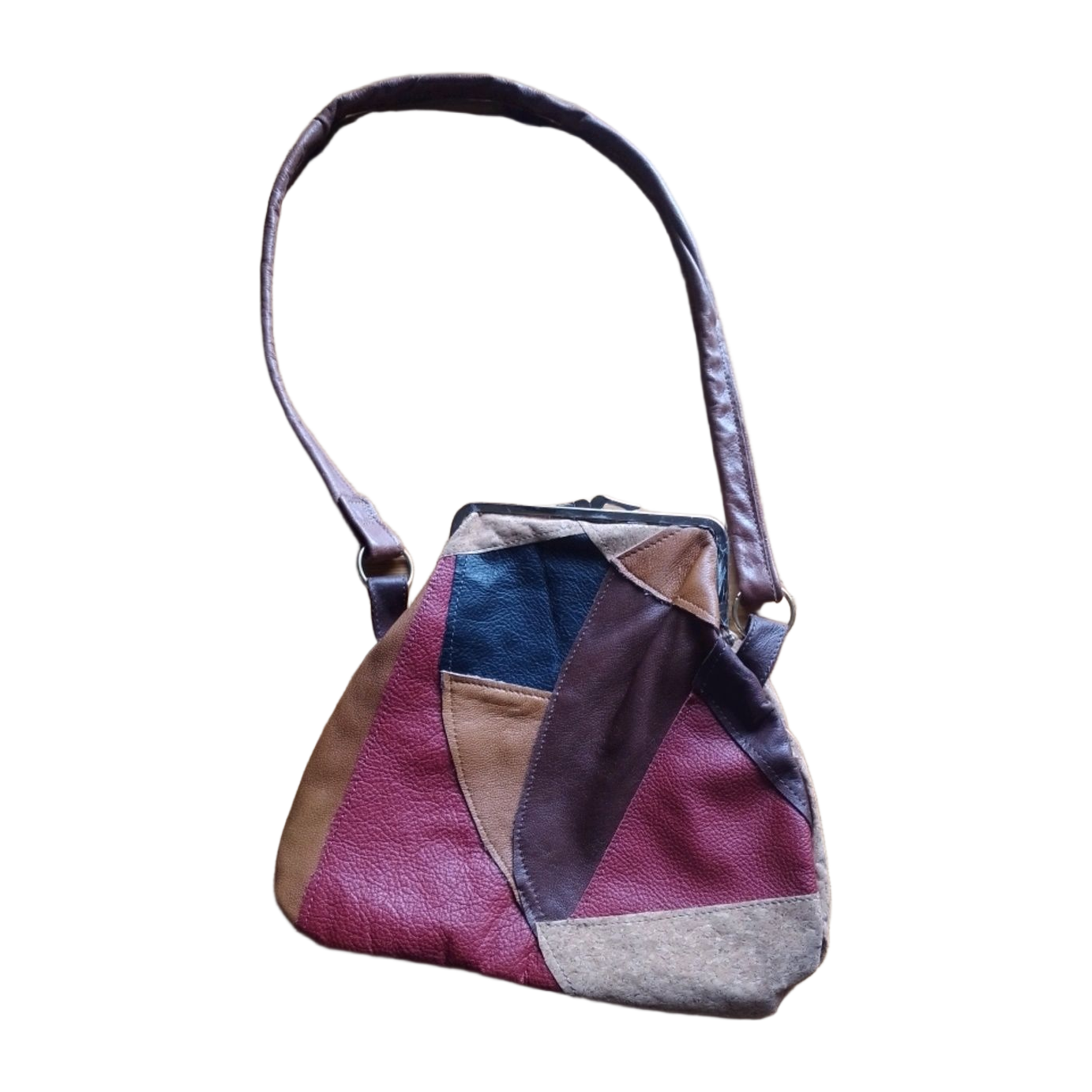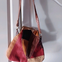 Nahkaa ja korkkikangasta, kangasvuori , kehys 14 cm korkeus 23 cm, pohjan leveys 25 cm, nahkahihna 80 cm DIY tuote