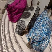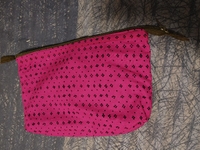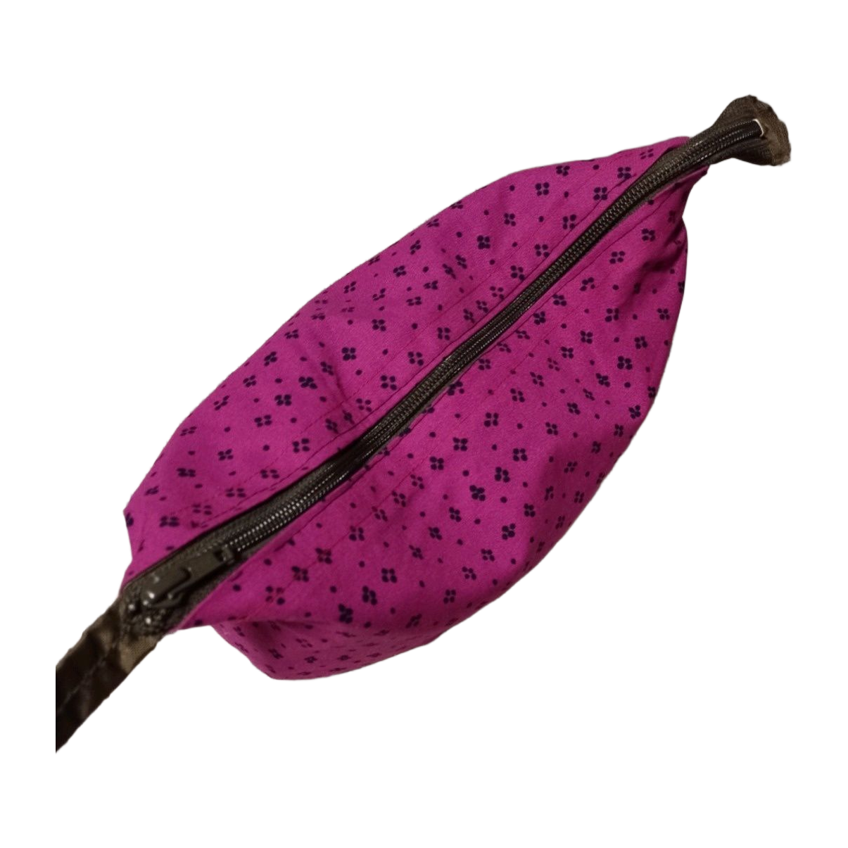 Marimekon Muija kankaasta itse ommeltu kosmetiikkapussi, sisällä muovitettu monilokeroinen pussukka. Sveitsin armeijan ylijäämäl varastosta peräisin