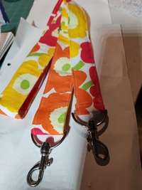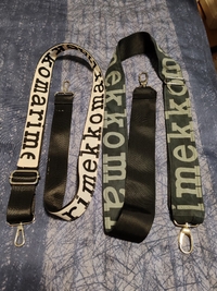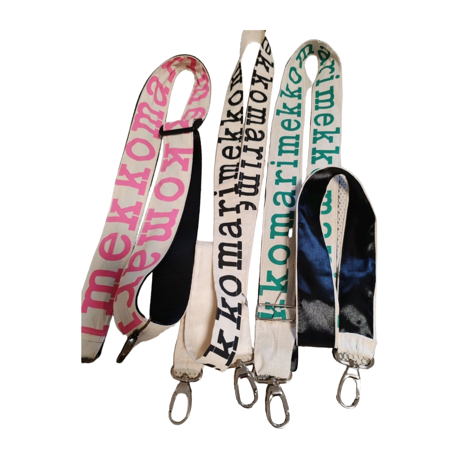 Laukun hihnat. Eri värejä. Säädettävä pituus. Itse ommeltu Marimekon Logokasseista, tukeva taustanauha