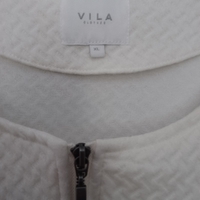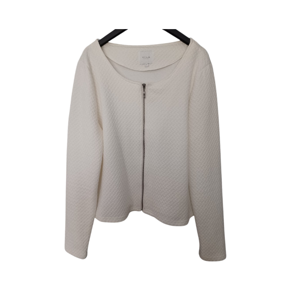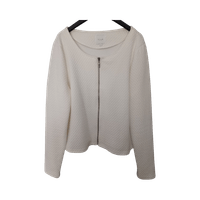 Valkea, teksturoitu, lyhyt neuletakki vetoketjulla.
