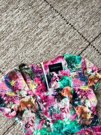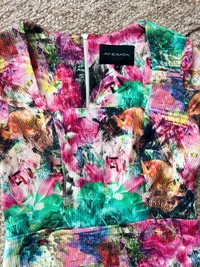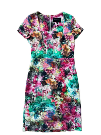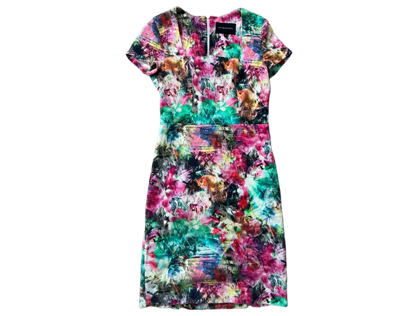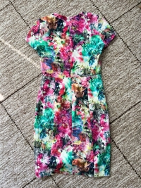 Värikäs kukkakuosinen mekko, lyhyet hihat, vetoketju takana.