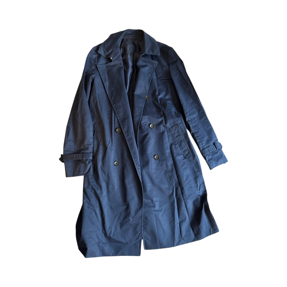 Pitkä kaksirivinen trenssi, klassinen ja siisti istuvuus.