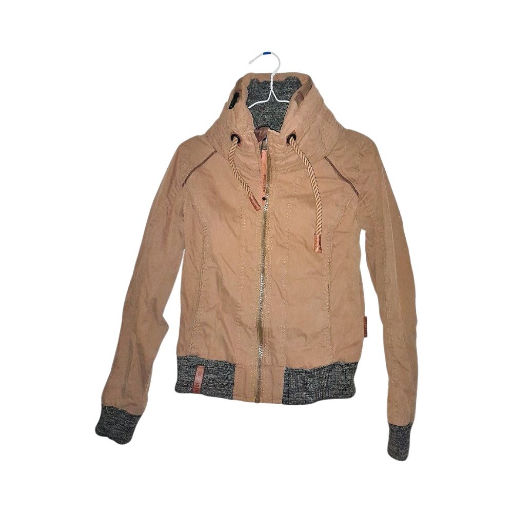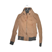 Ruskea takki, harmaat resorit helmassa ja hihoissa.