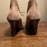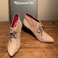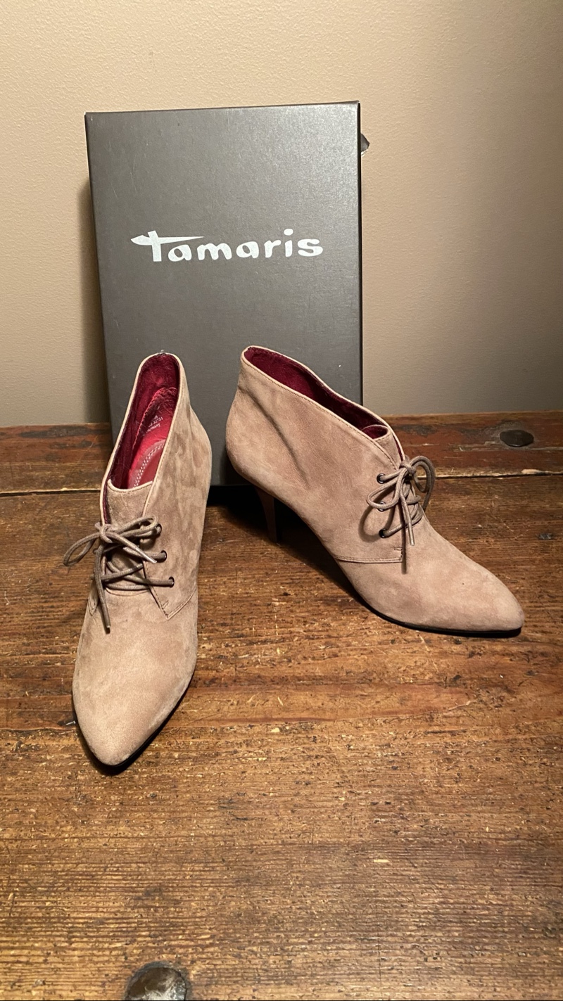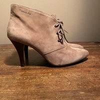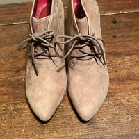 Beige mokkanahkaiset nilkkurit, nauhalliset, korko 8 cm.