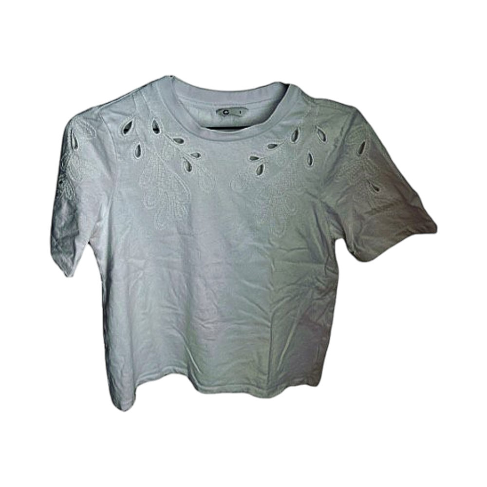 Lyhyt valkoinen t-paita kirjailuilla cut out -yksityiskohdilla.