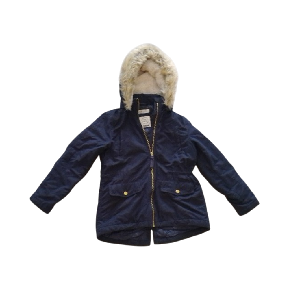 Tummansininen hupullinen parka, lämmin vuoraus, kullanväriset napit.