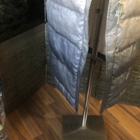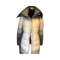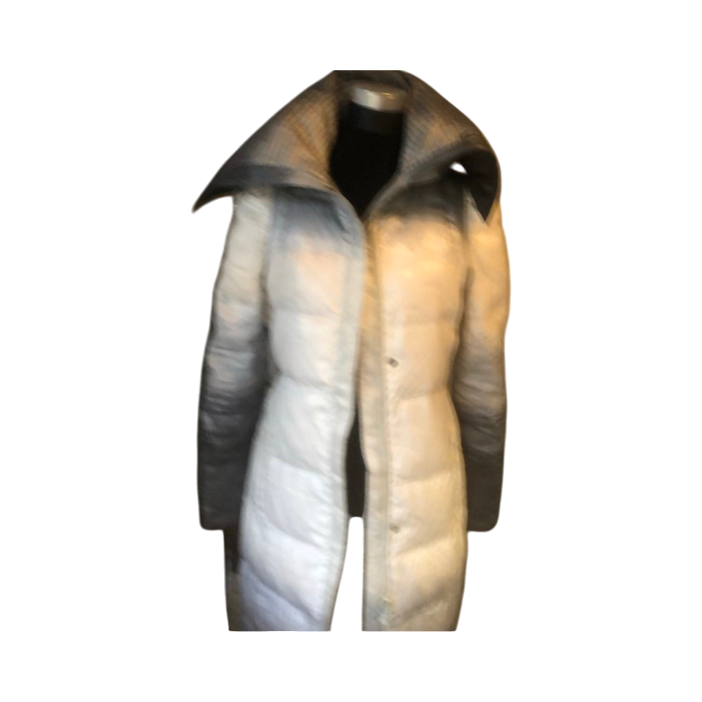 Pitkä toppatakki, vaaleat ja harmaat sävyt, lämmin.