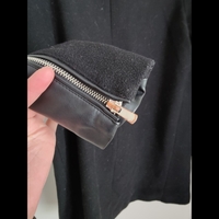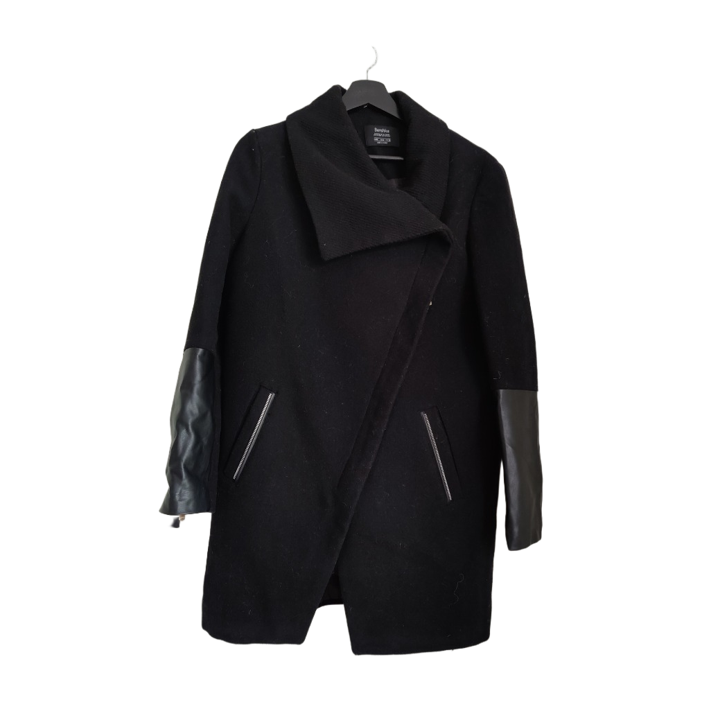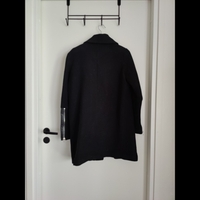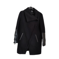 Vähällä käytöllä ollut siisti, biker-tyylinen tekonahkahihainen villakangastakki vinolla vetoketjulla. Trendikäs suora malli. Koko M, jota mielestäni vastaa, mutta menee hyvin myös S-kokoiselle, jos tykkää että on vähän oversize. Vetoketjuissa värimuutosta ja jokunen nyppy hihoissa, mutta muuten ei moitteita.