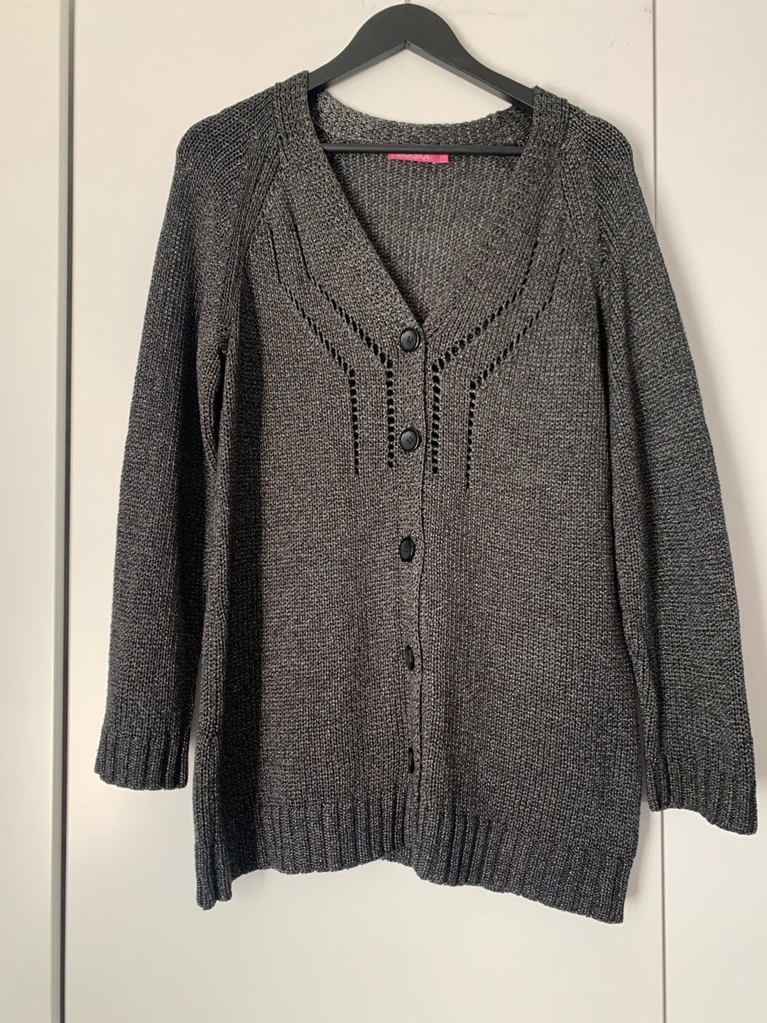 Indiskan väljä M koon neuletakki tummanharmaata lankaa kimalteella. Semmoista akryyliä mikä ei nyppyynny!