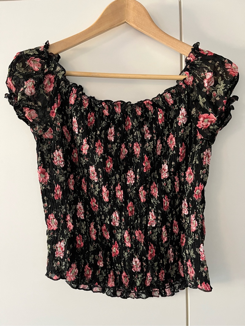 Musta punertavilla kukilla oleva off-shoulder toppi, hieman puhvihihat. Istuu myös hyvin vaikka pitää normaalisti hihat olkapäillä. Torso on kokonaan rypytetty eli paita joustaa paljonkin, menee näin ollen myös pienempi tai isompi kokoiselle