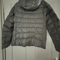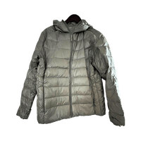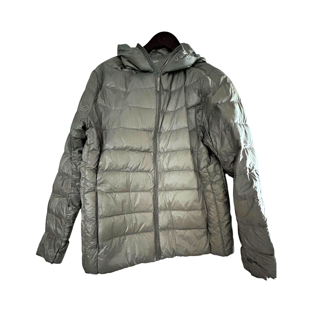 Keskiharmaa Uniqlo-kevyttoppatakki: hieman kiiltavä pinta, huppu, veroketju edessä. Niukahko Uniqlo-mitoitus.