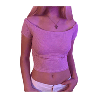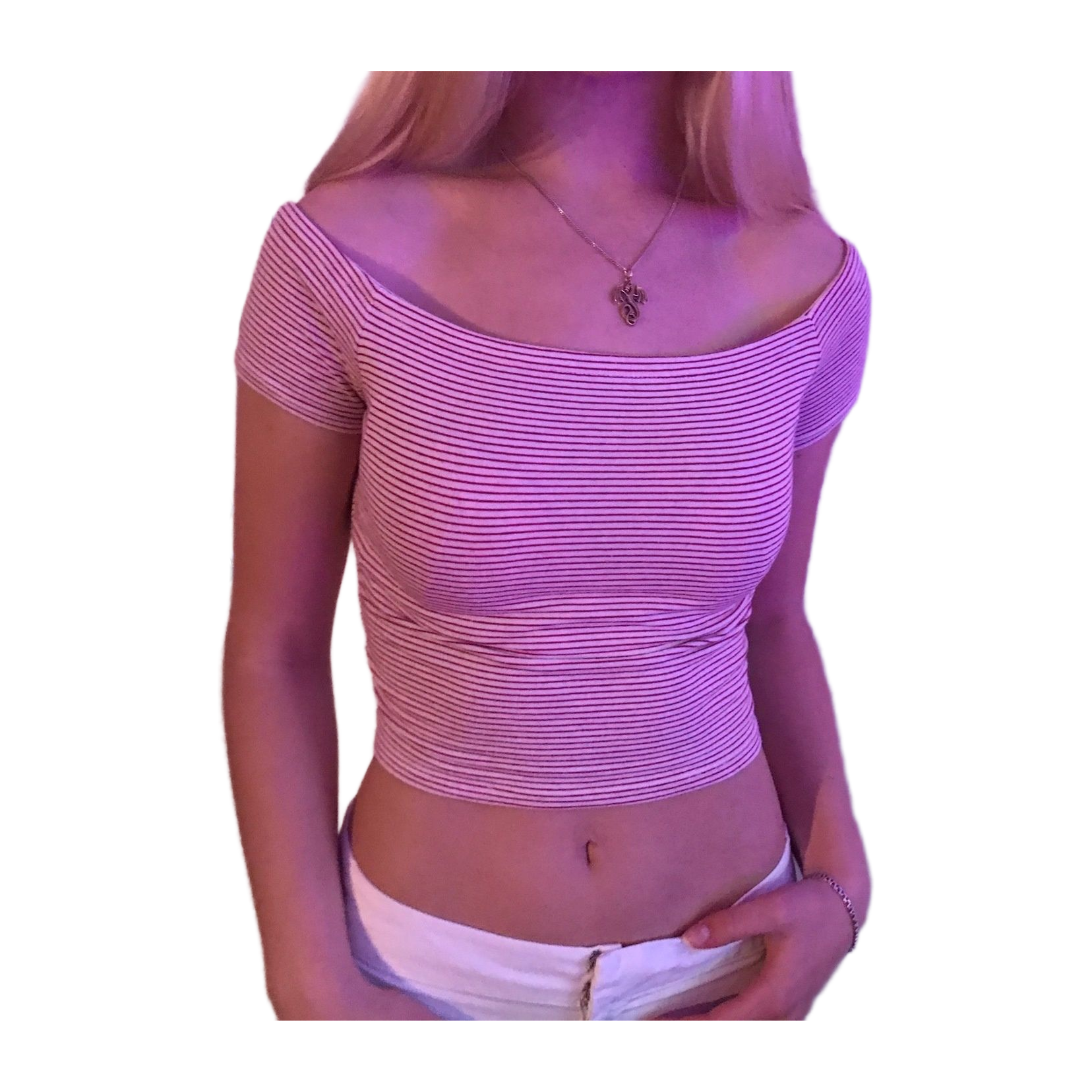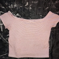 Puna-valkoraitainen off the shoulders- mallinen paita.