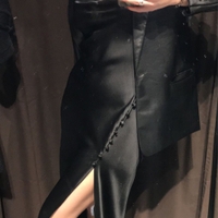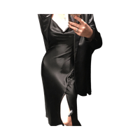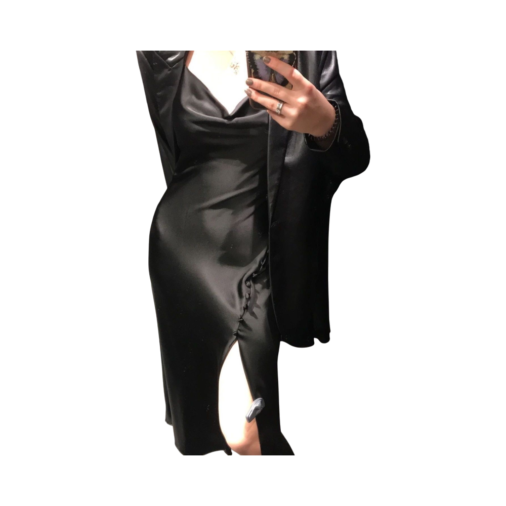musta satiininen about nilkkoihin asti pitkä mekko, jossa sivussa leikkaus ja koristenapit.