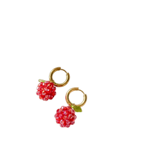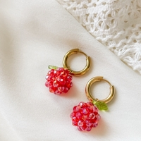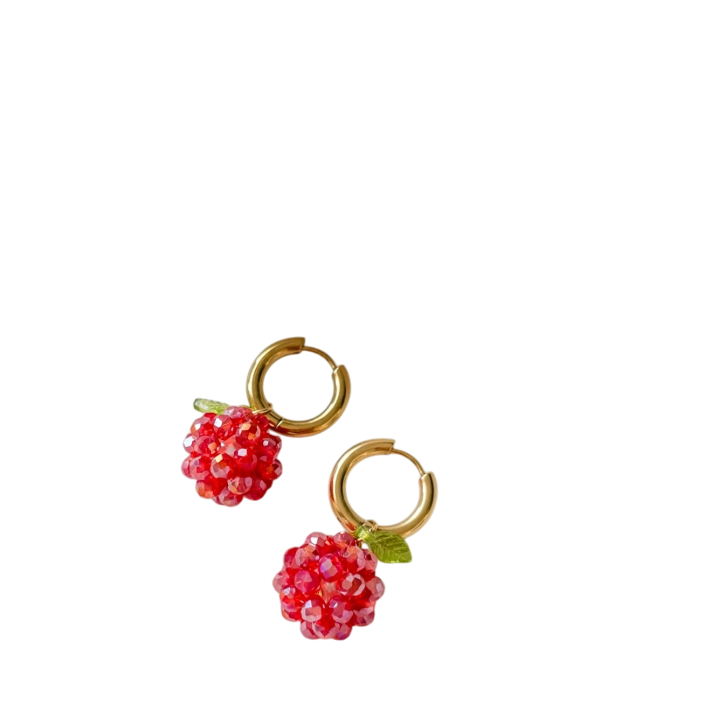 Helmikukkaset, punaiset marjakorvakorut kultaisilla renkailla.