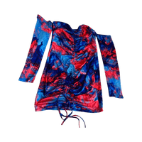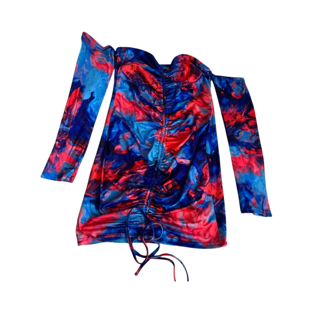 Pitkähihaista, rypytettyä ja vartaloa myötäilevää juhlamekkoa.