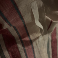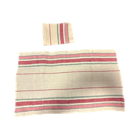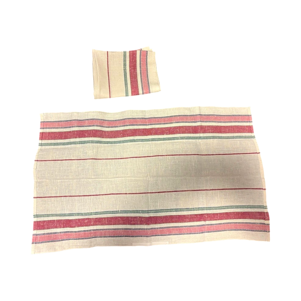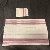 Kaksi valkoista pyyhettä/liinaa vaaleanpunaisilla/pinkeillä ja vihreillä raidoilla, lyhyempi 63cm ja pidempi 69cm, leveys n. 43cm.