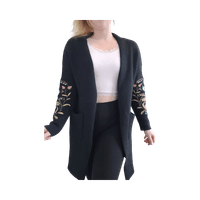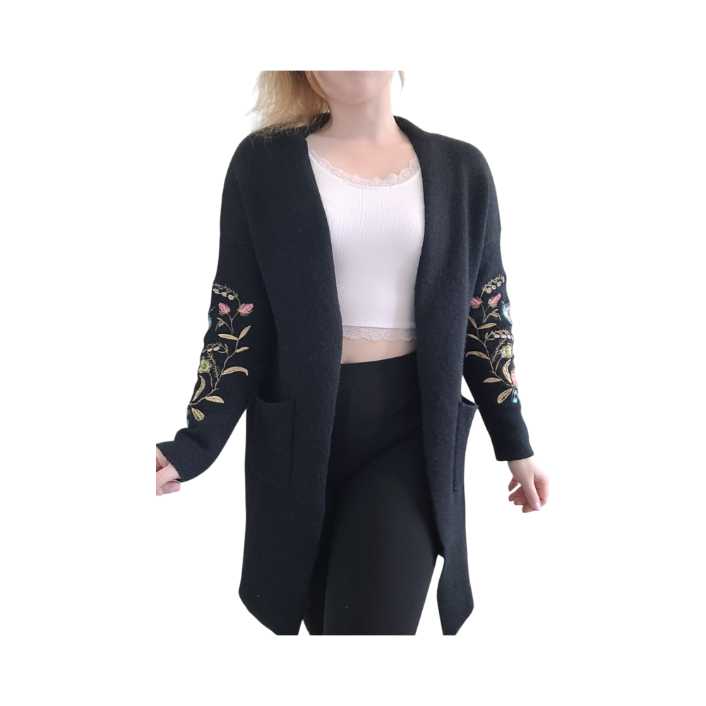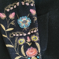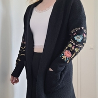 Pitkä (puolireiteen ulottuva) musta villatakki, jossa taskut edessä. Avonainen malli, ei siis mitään nappeja tai vetoketjua. Hihoissa nätit värikkäät kukkakirjailut.