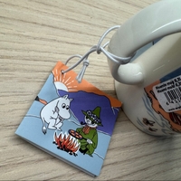 Muumimuki on lähes uutta vastaavassa kunnossa, eli se on käyttämätön, pahvikortti on tallella ja tarrat ovat paikallaan – tarroissa on kylläkin sen verran mainittavaa vikaa, että sisätarra repsottaa vähäisesti (kuvienmukaisesti), ja ulkotarra on ilmeisesti ottanut vähäistä jälkeä vitriinissä toisista mukeista, kun pölyjä on pyyhitty. 😅