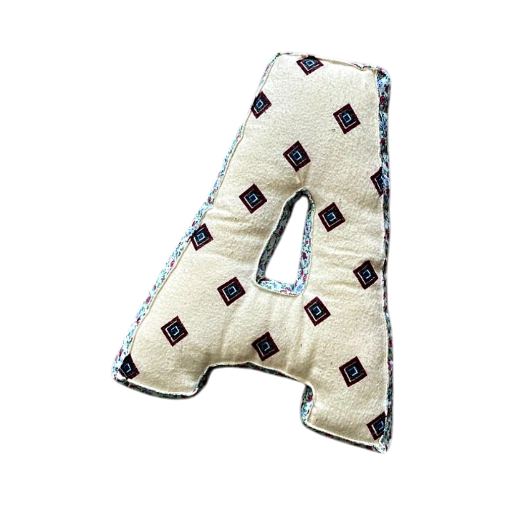 A-kirjaimen mallinen koristetyyny. Itse tehty. Korkeus n. 30 cm.