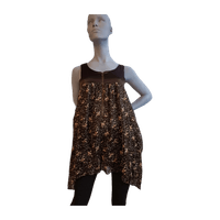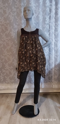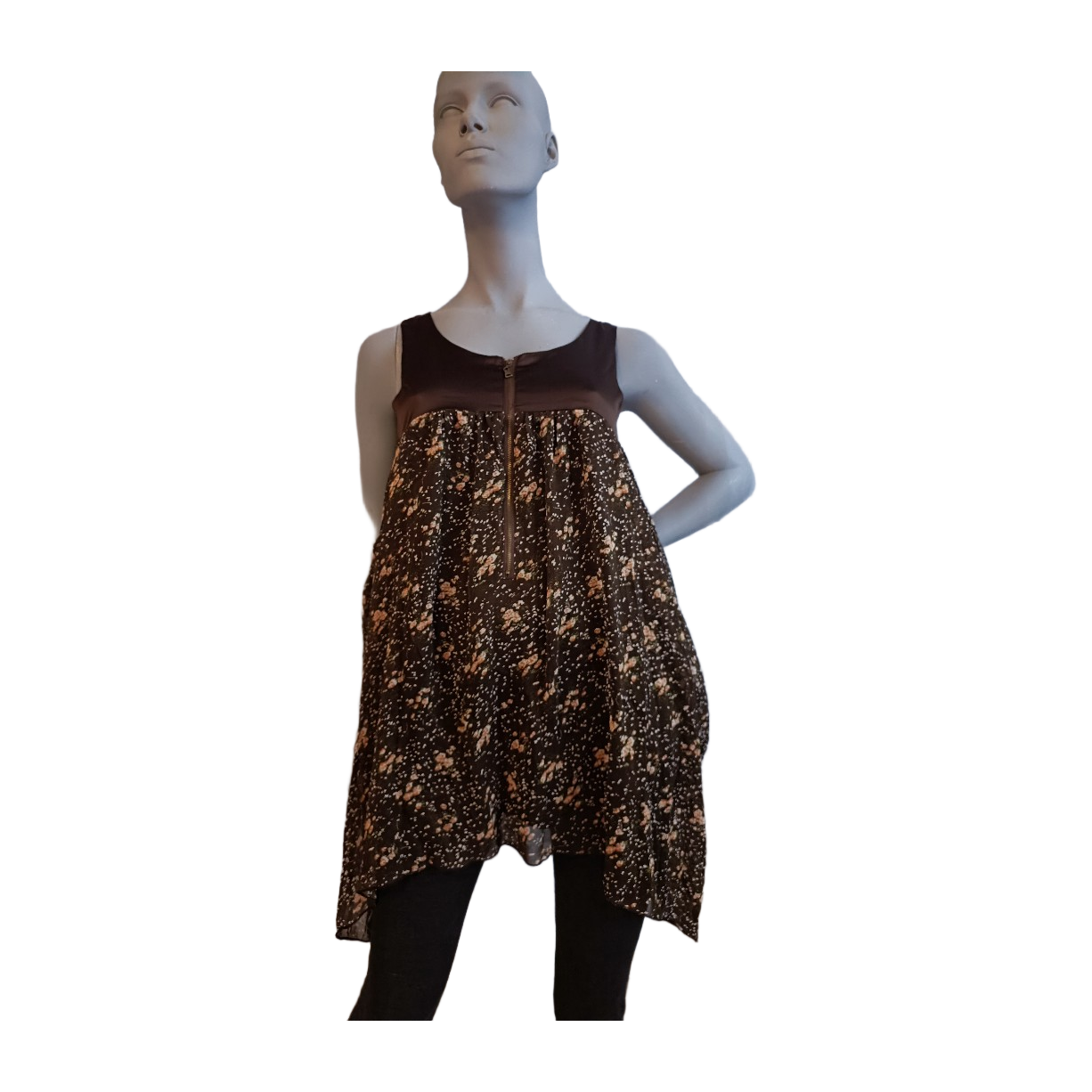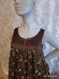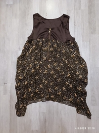 Kerran käytetty nätti mekko. Yläosa suklaanruskeaa satiinia, helma ruusukuvioista sifonkia. Epäsymmetrinen helma. Vetoketju edessä. Ostettu Thaimaasta.