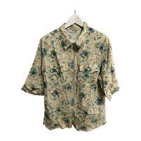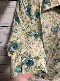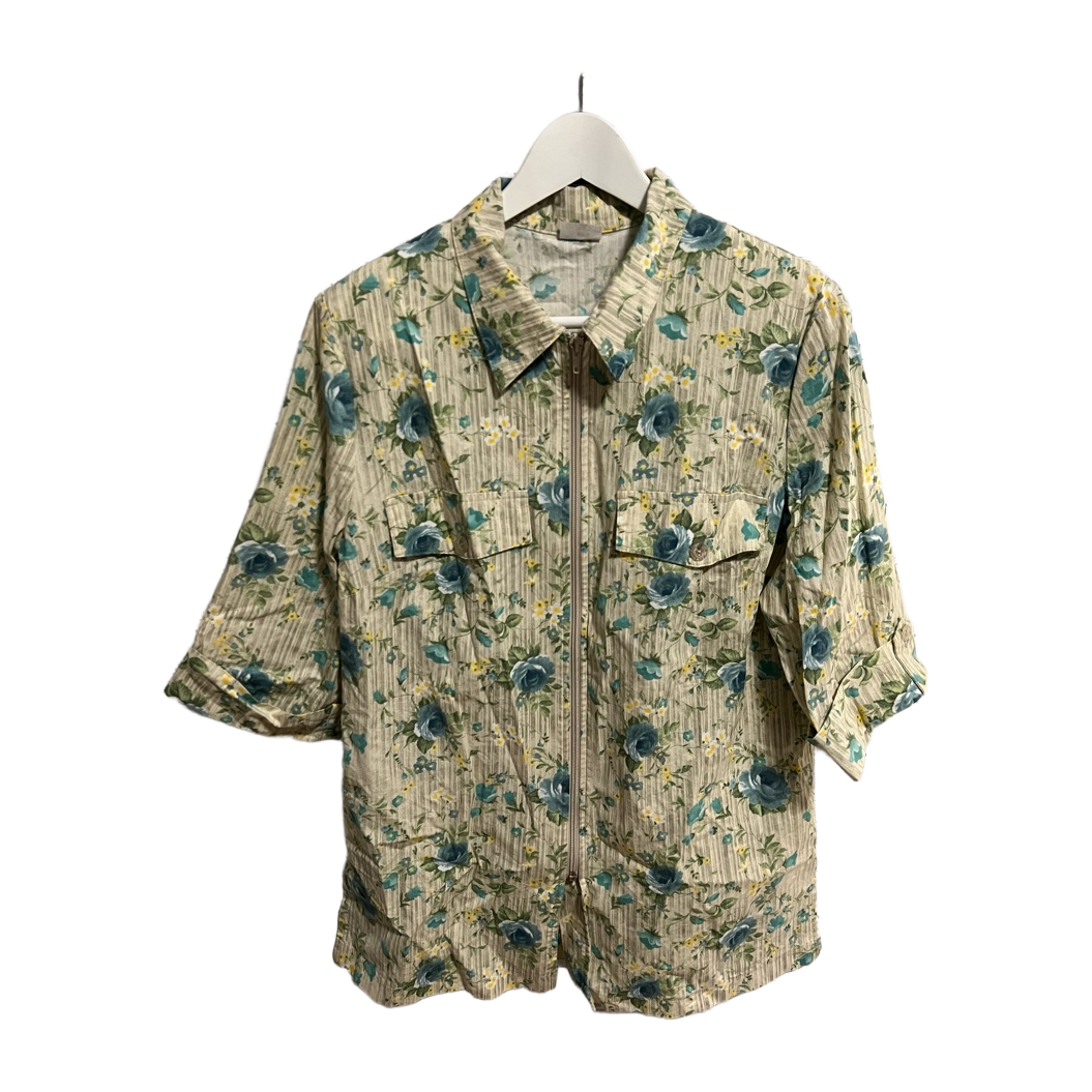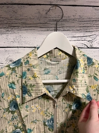 Vihreäsävyinen kukkakuosinen paitatakki vetoketjulla ja rintataskuilla. Suomalaista vintagea. Sopiva M/L-kokoiselle. Olkatoppaukset.