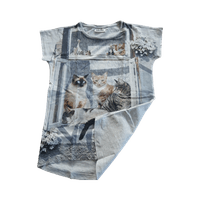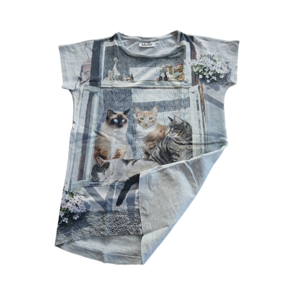 Lyhythihainen lasten t-paita, kissaprintillä. Merkki MOLO. Koko 164/14 v. On käytetty paljon. Ehjä js puhdas. Mene myös xs aikuiselle.