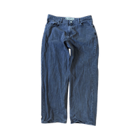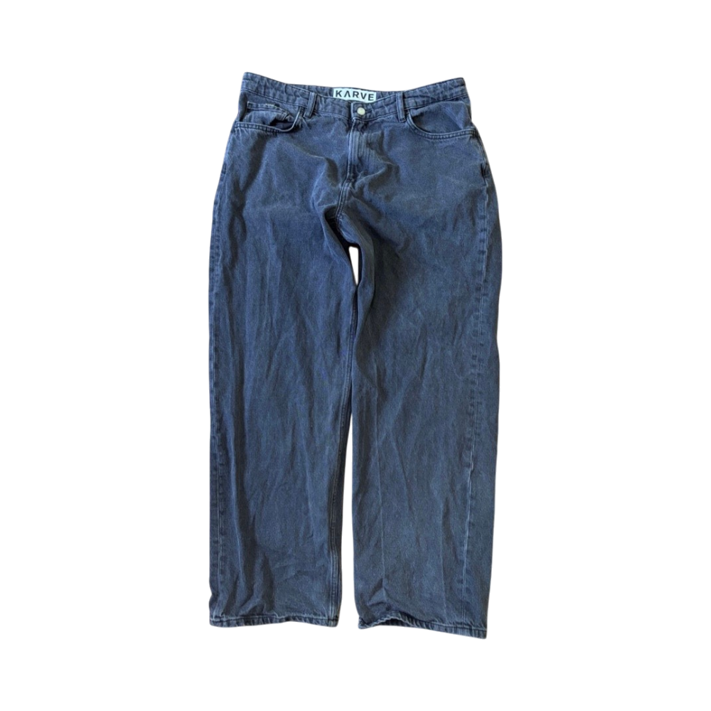 Miesten mustat leveälahkeiset farkut, löysä istuvuus.