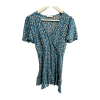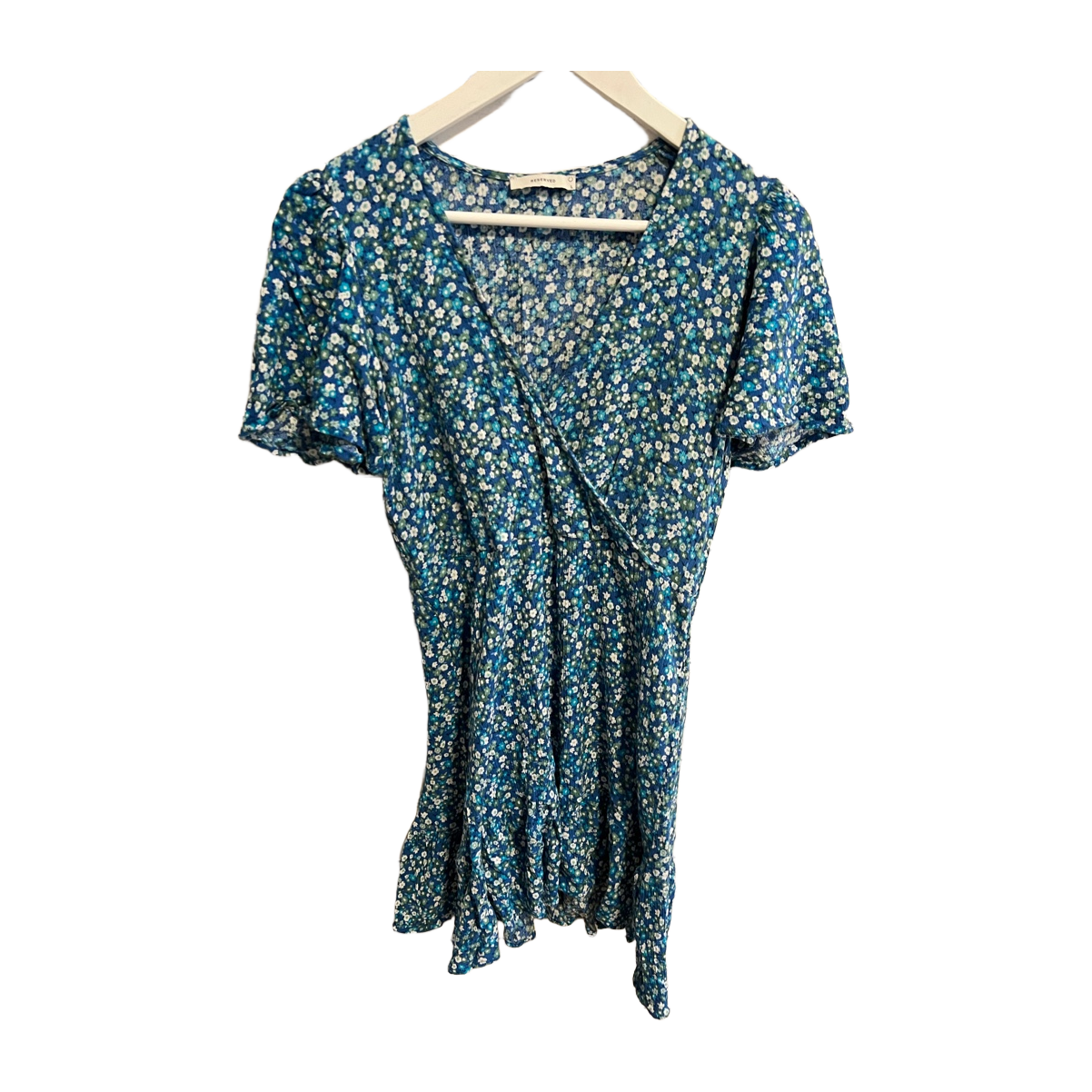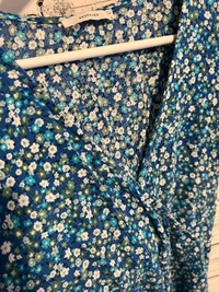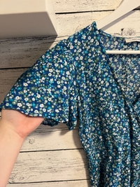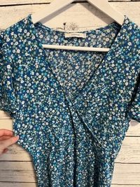 Kaunis sininen kukkamekko, kokolapussa L mutta vastaa enemmän pientä M-kokoa. Kunnossa ei moitittavaa.