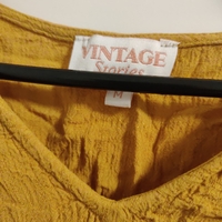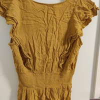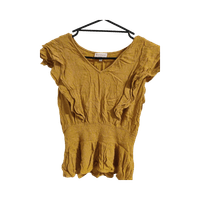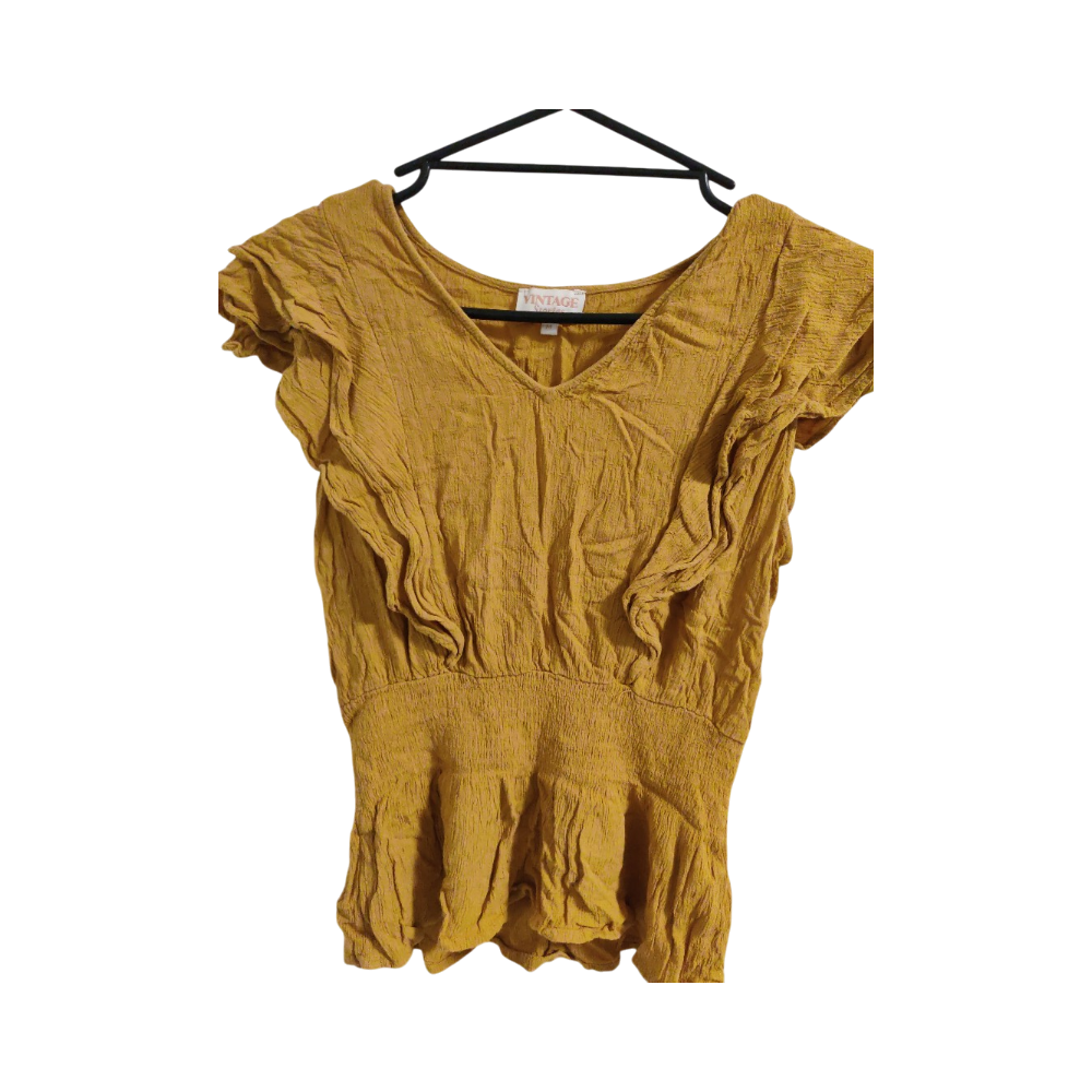 Keltainen v-kaulainen röyhelötoppi, vyötäröllä shirring-yksityiskohta.