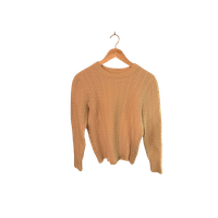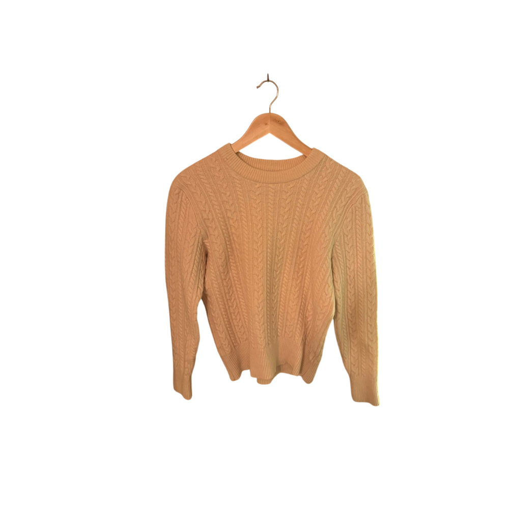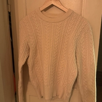 Cream cable-knit crewneck sweater, warm and classic design. 100% wool, fits s-m