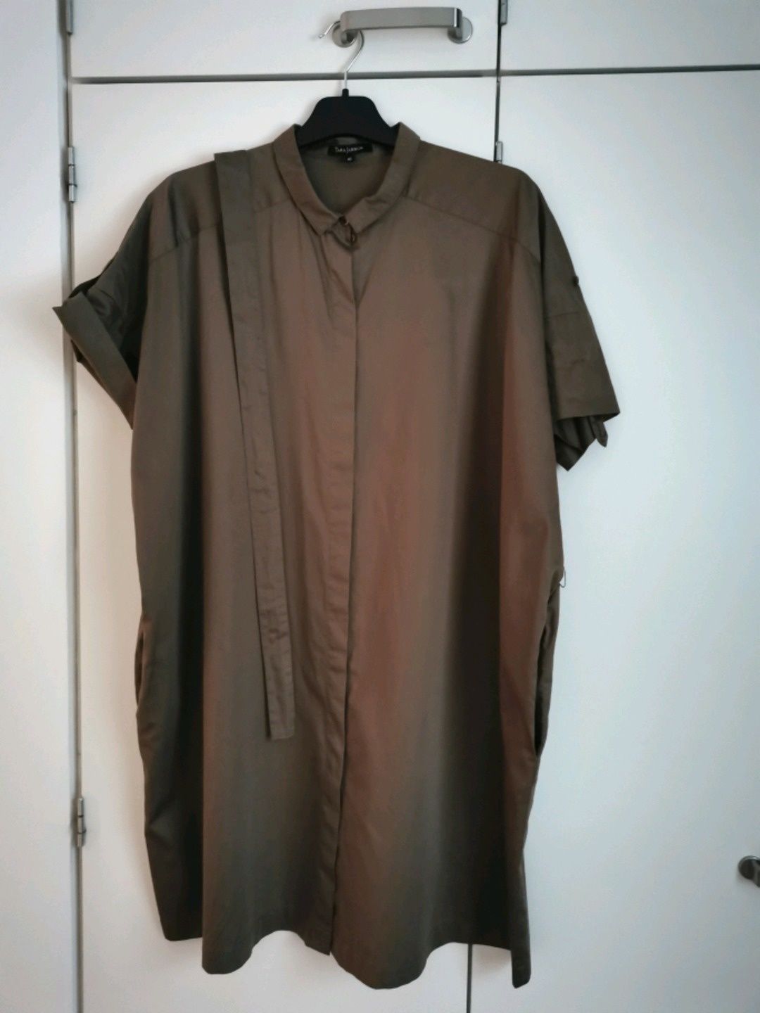 Puuvillainen tunika/mekko koossa 40. Edessä napit, sivusaumoissa taskut. Pitkä vyö samasta kankaasta.