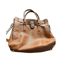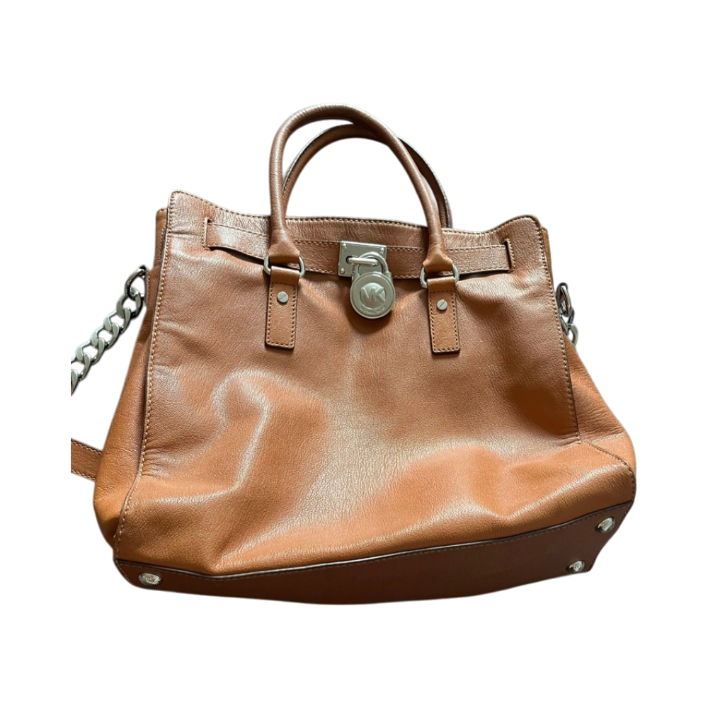 Brown leather tote with chain strap and MK logo lock.