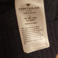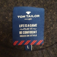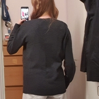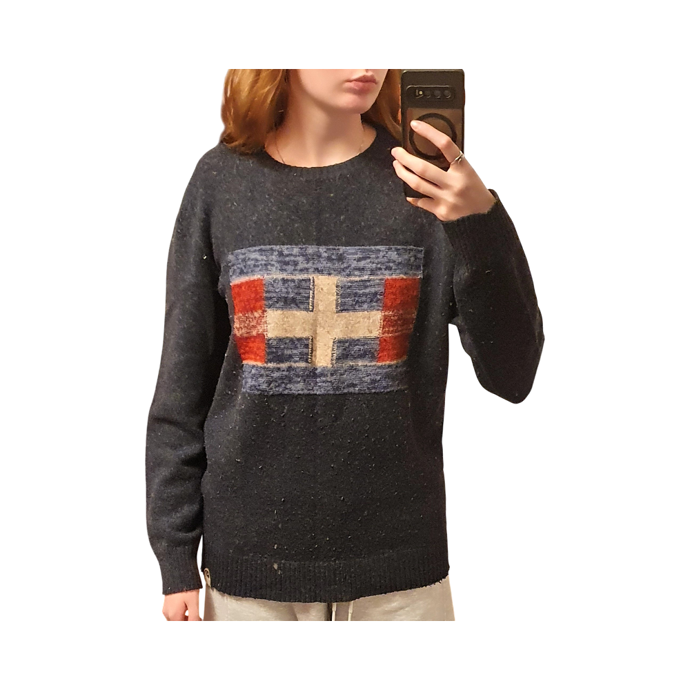 Tummansininen neulepaita, jossa lippumalli edessä.
