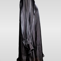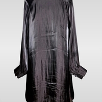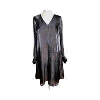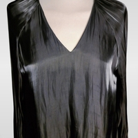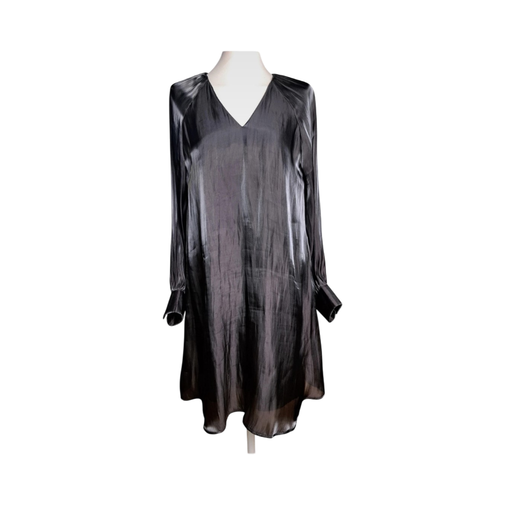 Elegant black satin-look dress with long sleeves and relaxed fit. Features a deep V-neckline, subtle sheen, and wide cuffs.