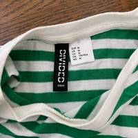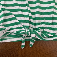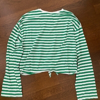 Pitkähihainen vihreä valkoraidallinen pusero, solmimisnauhalla. Hieman levenevät hihat ja lyhyempi helma.