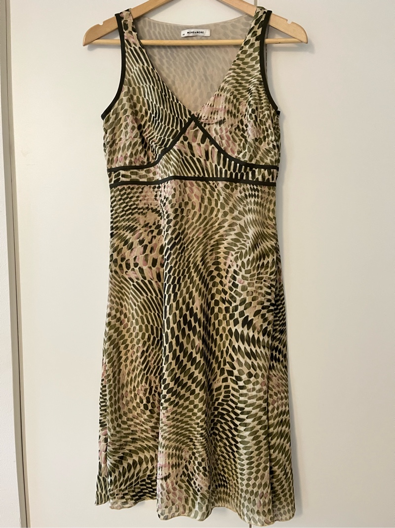 Vihreä kuviollinen kesämekko koossa 36, myös kerman ja roosan väriä. Suunnilleen polvipituinen riippuen käyttäjästä. Käytetty pari kertaa