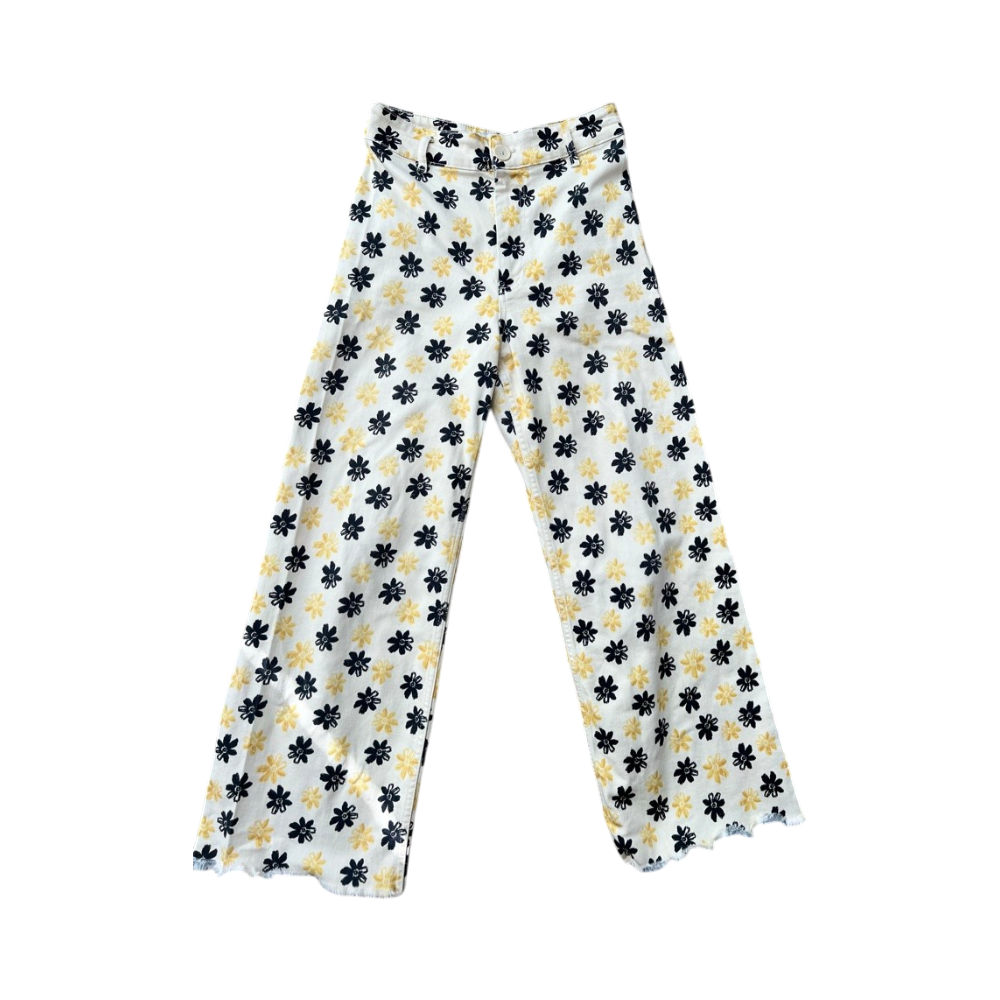 Zaran leveälahkeiset kukikkaat farkut, hyvässä kunnossa. Koko 40, lahkeen sisämitta noin 70cm ja vyötärönympärys noin 70cm