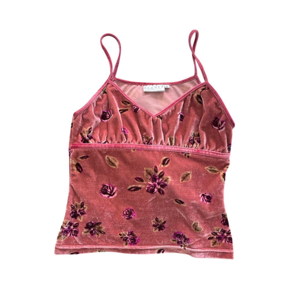 Pink velvet cami with floral pattern and thin straps. From the 90’s, Hennes collection.