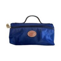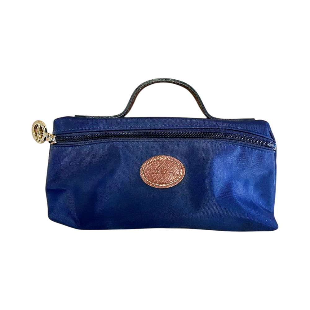 Pieni käsilaukku nahkaisella kahvalla, pientä kulumaa ja pieni vekki takana.