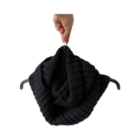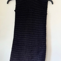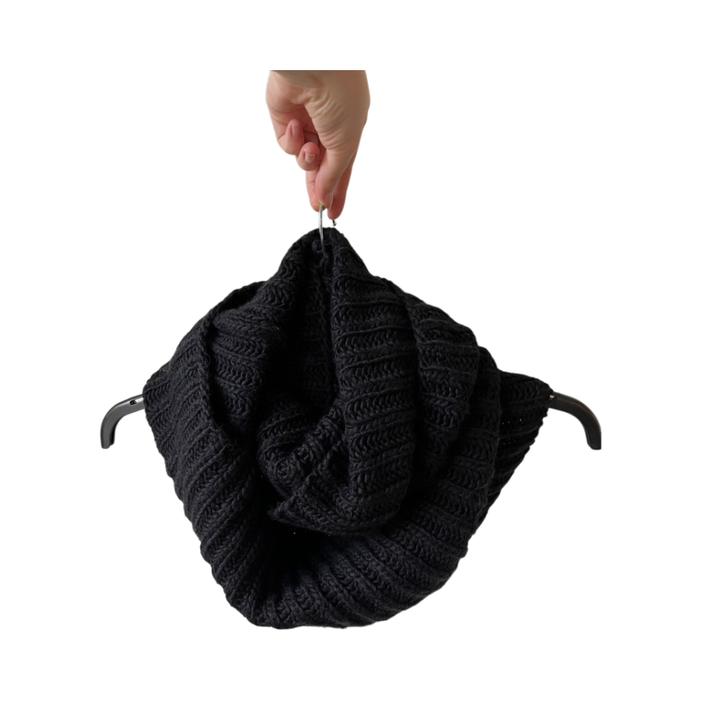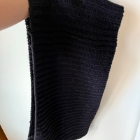 Musta lämmin tuubihuivi, joka menee 2 kertaa kaulan ympärille. Materiaalilaput leikattu irti