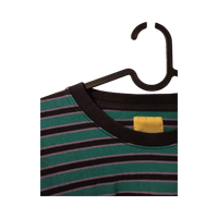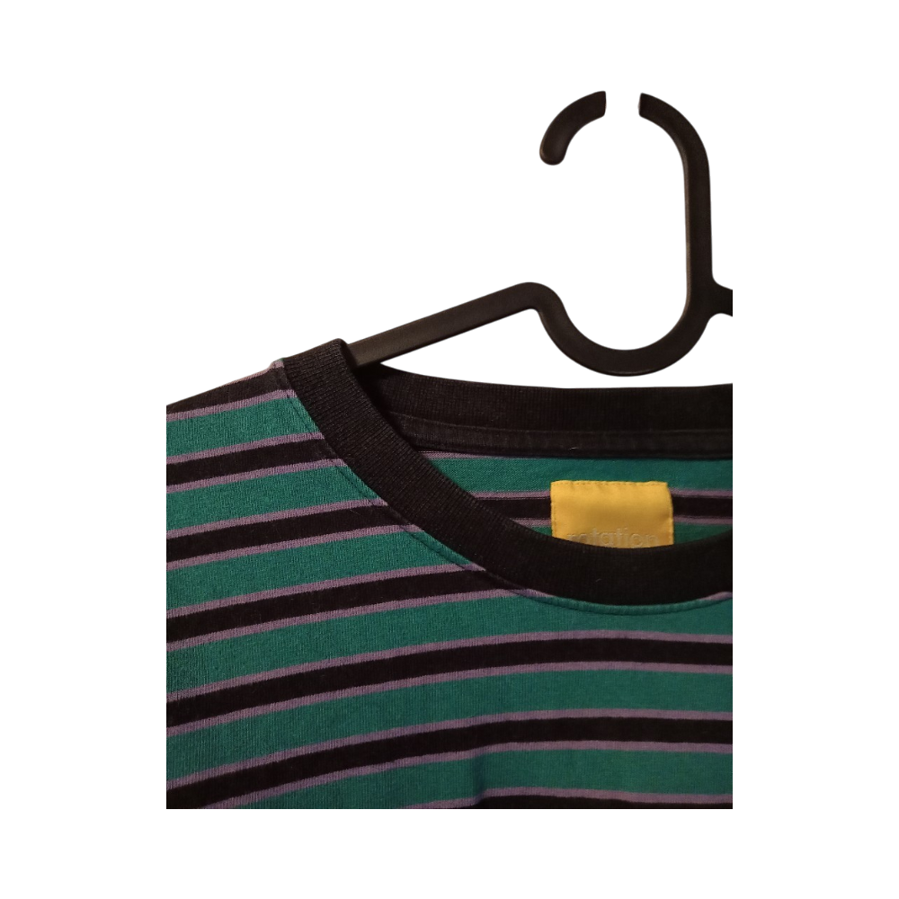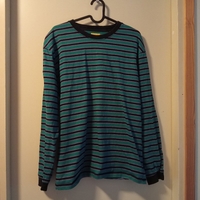 Vihreä-musta raidallinen pitkähihainen paita, rento istuvuus.