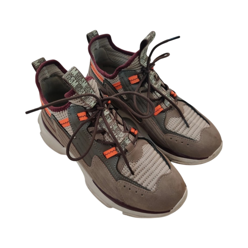 Täydelliset syyskengät trendikkäissä ruskean ja oranssin sävyissä. Kenkiä on käytetty työkenkinä noin kuukauden ajan sisätiloissa, mutta ne osoittautuivat itselle hieman pieniksi. Kunto on erittäin hyvä – käyttö näkyy lähinnä pohjissa. Tennarit ovat tukevat ja erittäin mukavat jalassa.