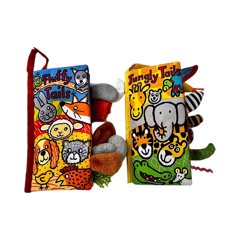 Pehmeä ja värikäs lasten kuvakirja eläimillä ja häntillä.
