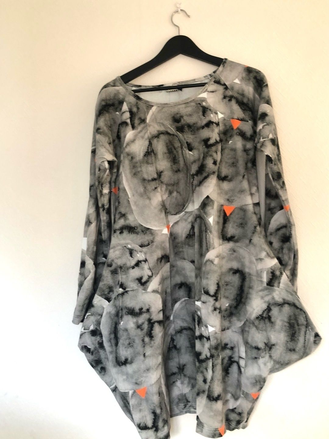 Papun kantomekko, kuosi on cotton candy. Käytetty ja pesty muutamia kertoja. En sanoisi että juurikaan on haalistunut, kuosi on sellainen että siitä on tosi vaikea haalistumista erottaakaan. Joustavaa puuvillatrikoota, alaosasta väljempi ja ylhäältä tiukempi istuvuus. Sopii tosi monenlaisille vartaloille ja on mukava päällä. Kuosi on älyttömän kaunis oransseine tehosteineen.