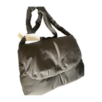 Trendy, oversized, soft with a long strap. One internal pocket. May be worn on shoulder or crossbody. Snap closure infront with a small logo letter.