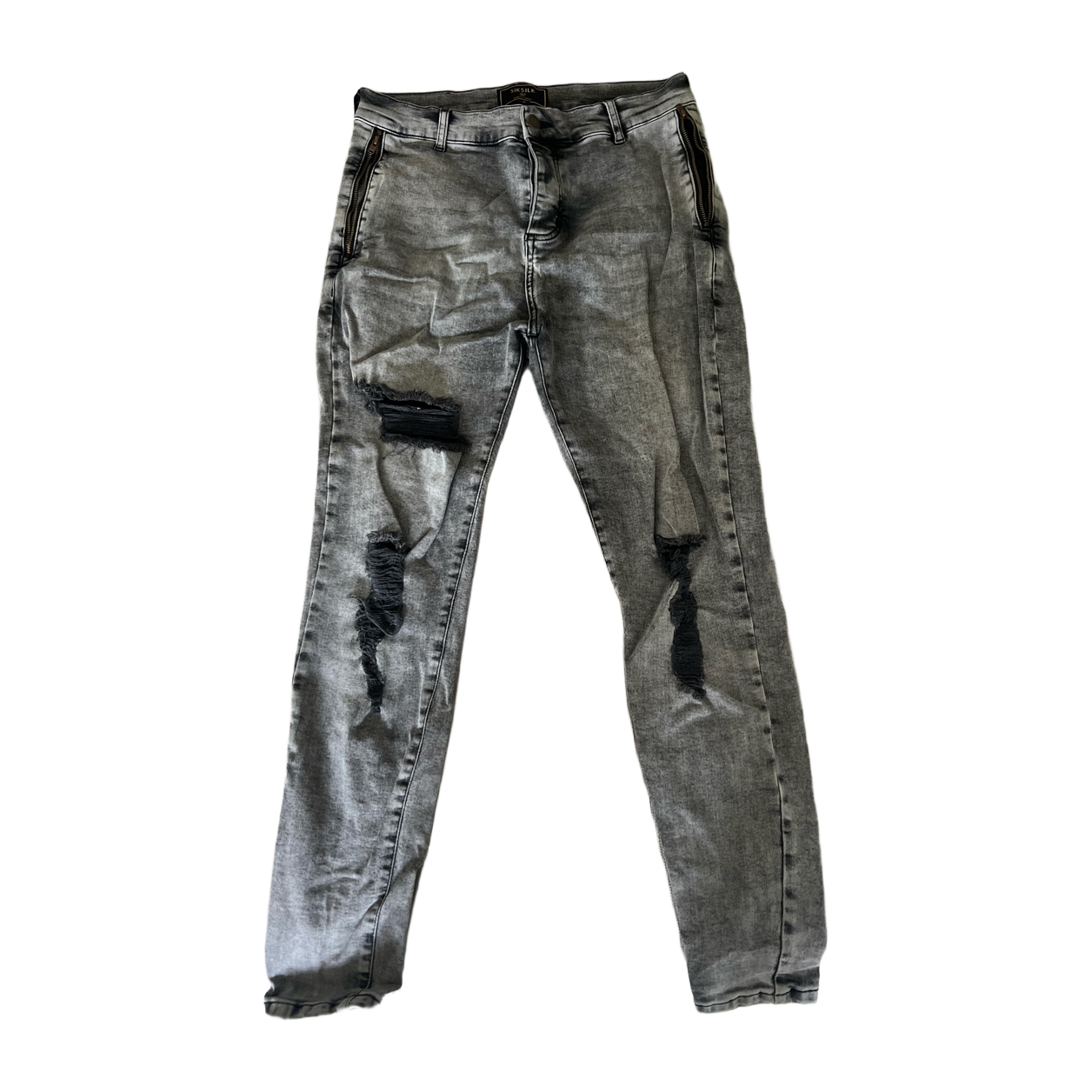 Miesten harmaat revityt farkut vetoketjutaskuilla.