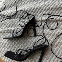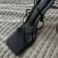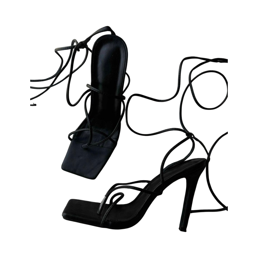 Square-toe lace-up high heel sandals, elegant evening wear.