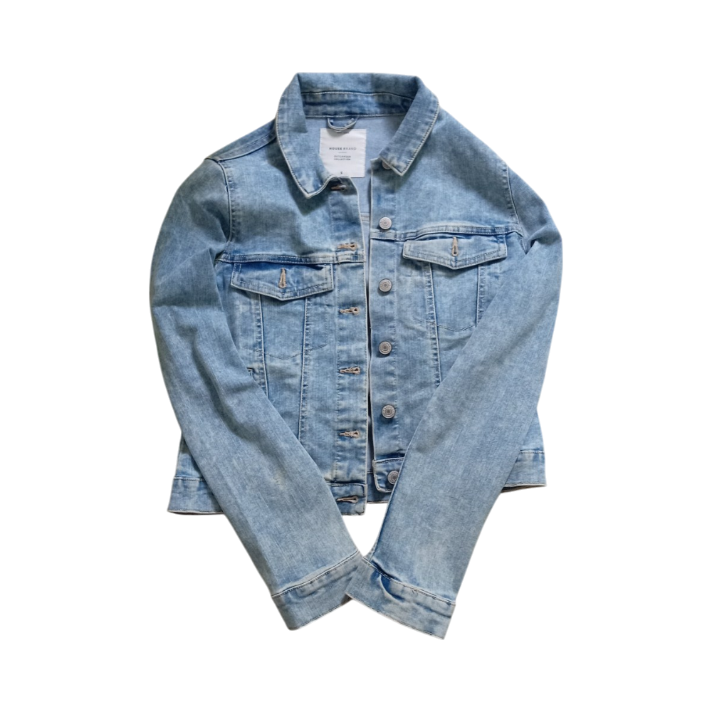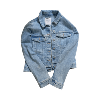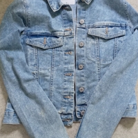 Lyhyt vaalea farkkutakki, napit edessä ja taskut.